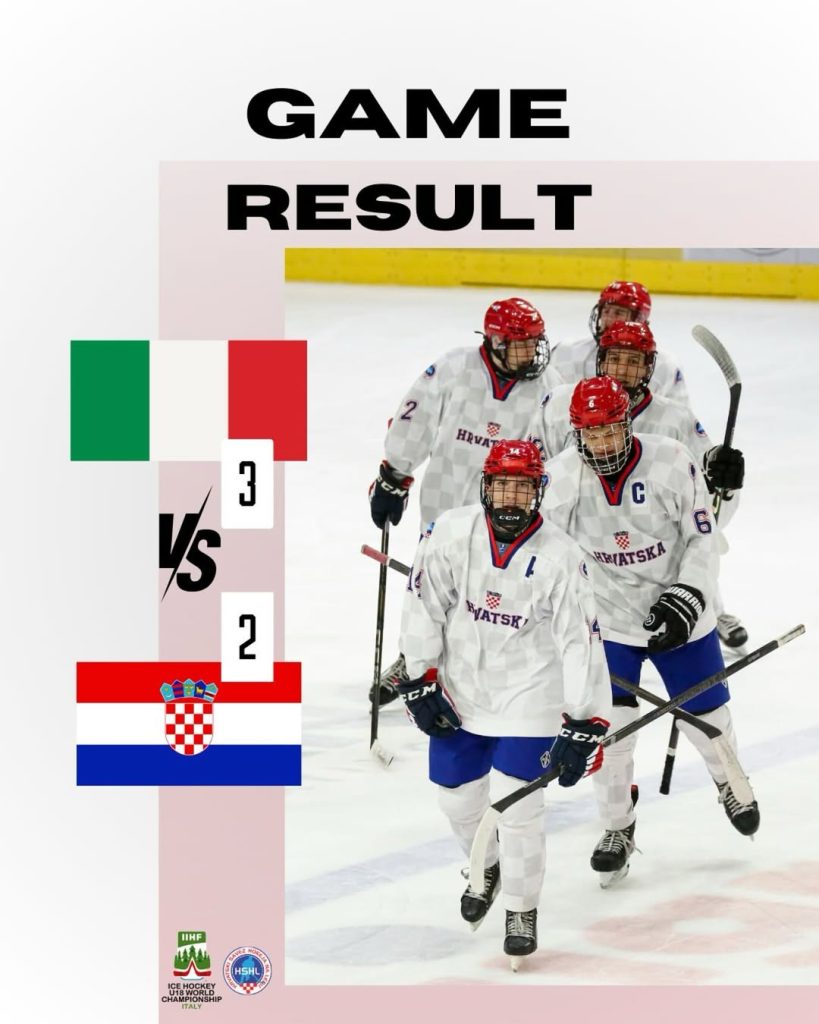 Prva trećina je završila neriješeno 2:2, u drugoj nije bilo pogodaka a u trećoj, četiri i pol minute prije kraja Alessandro Parco zabija za pobjedu i konačnih 3:2 za Talijane.